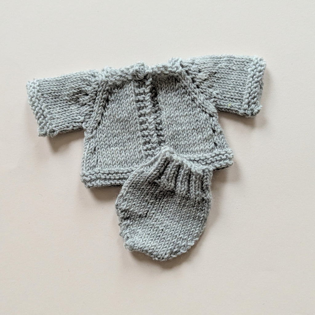 A hand knitted long cardigan with matching bloomers all in soft pure merino yarn. Fastening at the front with a tiny crochet bobble. Soft Sea Foam blue.