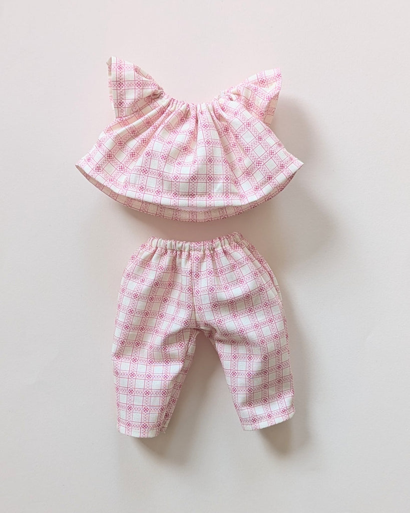 A two piece PJ set for our midi dolls or animals. Made in a sweet checked cotton with an elasticated, frilled shoulder neckline and elasticated bottoms.