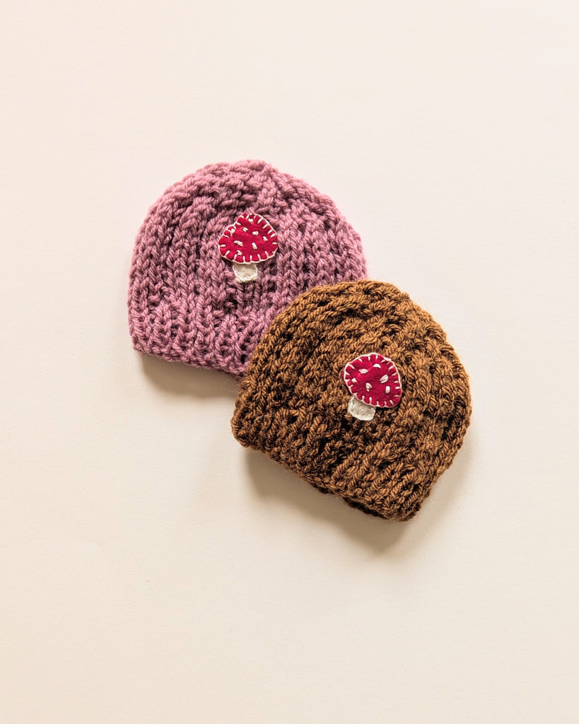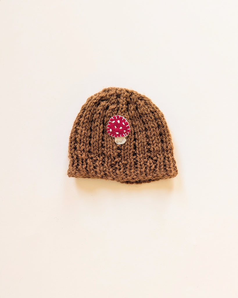 A soft stretchy beany hat with a wool felted mushroom motif.
