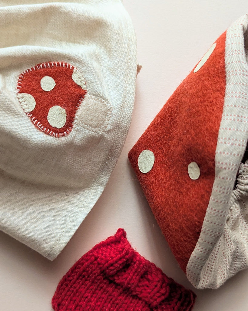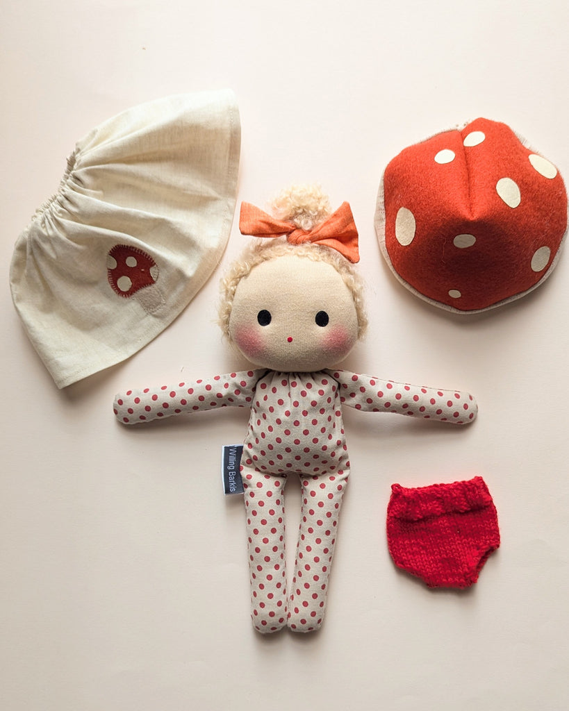 She is a lovable waldorfstyle doll with soft blonde natural mohair hair and a Tilda cotton printed body. She wears a cotton chambray skirt with a mushroom motif, hand knitted bloomers and a wool mushroom beret!