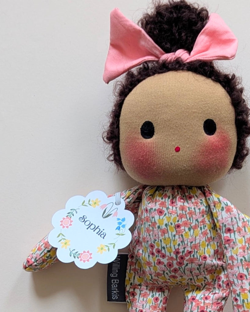 Sophia is a lovable waldorfstyle doll with soft dark brown natural mohair hair, light brown skin and a Liberty print cotton body.