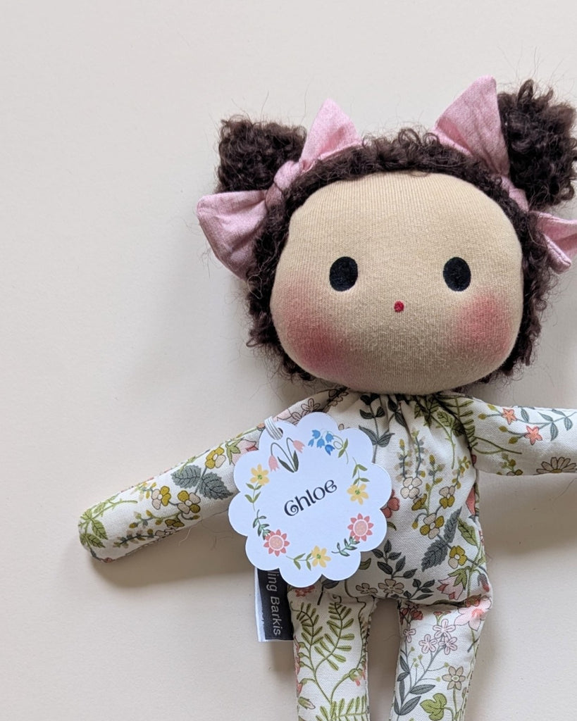 Chloe is a lovable waldorfstyle doll with soft dark brown natural mohair hair and a Liberty print cotton body.