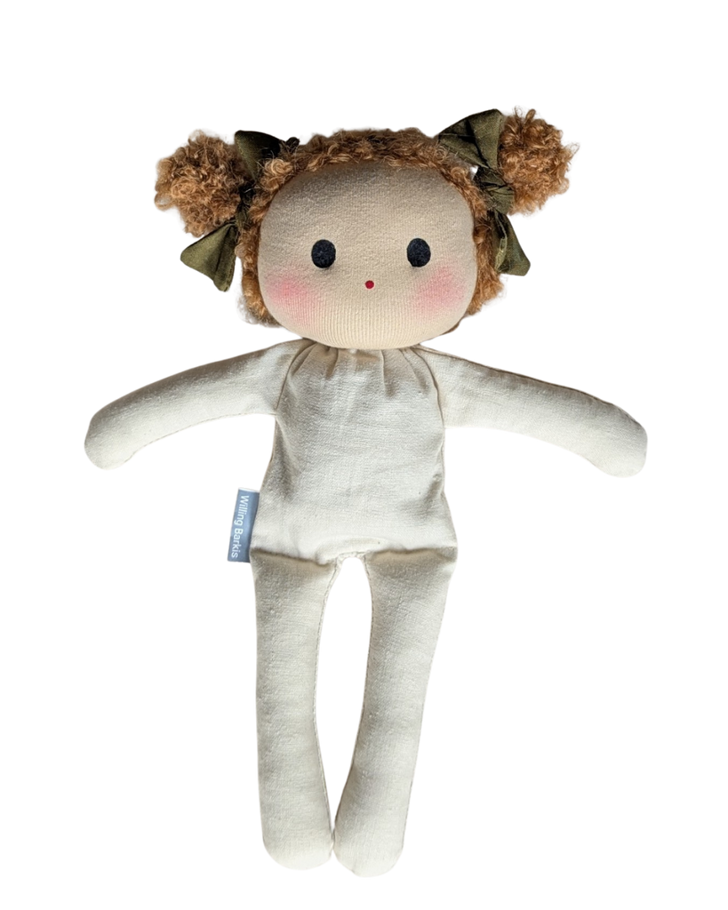Our waldorfstyle dolls are handmade by us from start to finish in the Willing Barkis workroom using soft De Witte Doll Jersey, natural mohair hair and good quality cotton. Filled with Hypoallergenic Hollow fibre stuffing.