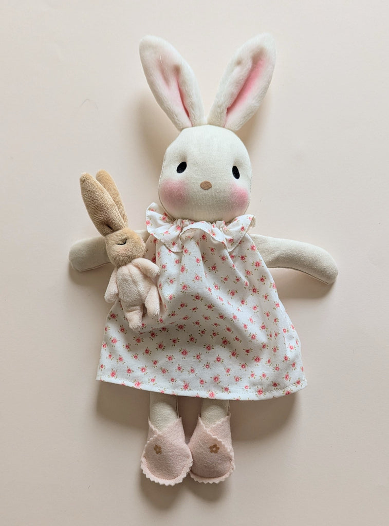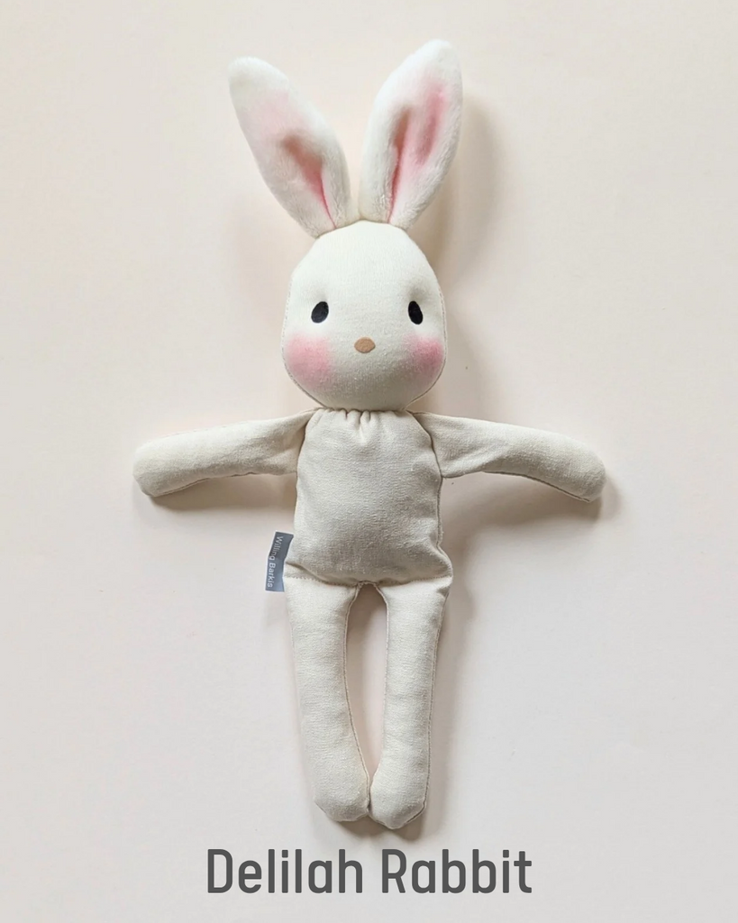 Delilah Rabbit is handmade using soft de witte doll skin, with a natural linen blend body and soft plush ears. Please noteb*clothes are sold separately* Clothes are sold separately.Each bunny is 32cms tall 13" and  has a soft body and floppy limbs - perfect to cuddle and play dress up with.