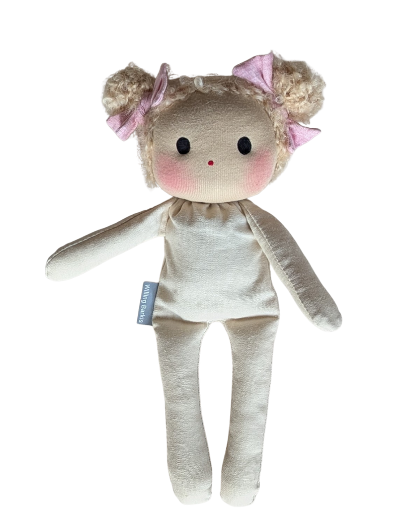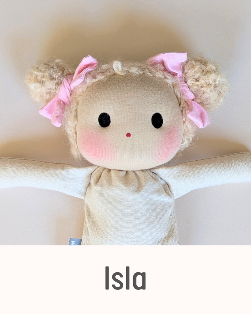 Isla is a lovable waldorfstyle doll with soft blonde hair and a linen blend body ready for dressing up and imaginative play.  Her hair is hand-knitted in a soft, natural mohair yarn