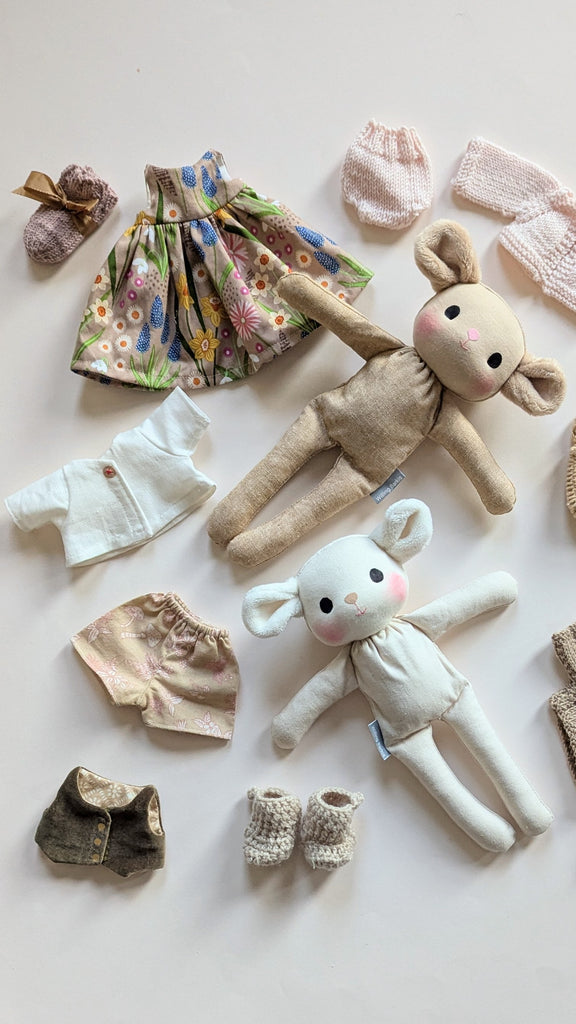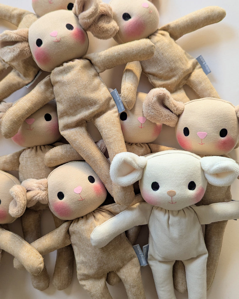 Willow Mouse is handmade using soft de witte doll skin, with a natural linen blend body and soft plush ears. Please note *clothes are sold separately* Each mouse is 27cms 11" tall and has a soft body and floppy limbs - perfect to cuddle and play dress up with.